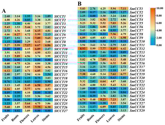 Expression profiles of SlCCT (A) and SmCCT (B) in five representative tissues (fruits, roots, flowers, leaves, and stems). The heat maps were generated based on the log2 (TPM + 1) values of CCT genes. Orange and blue indicate higher and lower transcript abundances, respectively.