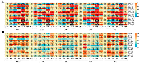 RT-qPCR expression analyses of (A) SmCCT and (B) SlCCT under hormone (ABA, EBR, ET, IAA, and SA) treatments. Leaves were collected 1, 3, 6, 12, and 24 h after treatment.
