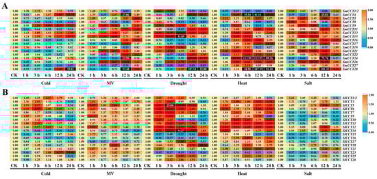 To preliminarily investigate the involvement of the CCT gene family in various abiotic stresses, we analyzed the expression levels of CCT family genes under cold, MV, drought, heat, and salt stress conditions across different treatment periods using RT-qPCR (Figure 8). Generally, most CCT genes respond to stress treatments, either through induction or inhibition. In eggplants, most SmCCT genes were induced and upregulated. For example, SmCCT12 and SmCCT15 were upregulated under various stress conditions. However, some genes displayed differential responses depending on the treatment. For example, the expressions of SmCCT16 and SmCCT27 were inhibited by cold and drought stress but upregulated in response to heat and salt stress. Notably, SmCCT24 and SmCCT28 showed distinct expression patterns, with downregulation in the early stages of MV, drought, heat, and salt treatments, followed by substantial upregulation in the later stages, indicating a potential feedback regulation mechanism. The inhibition of SmCCT27 under cold, MV, and drought stress conditions was remarkable, particularly under drought conditions.