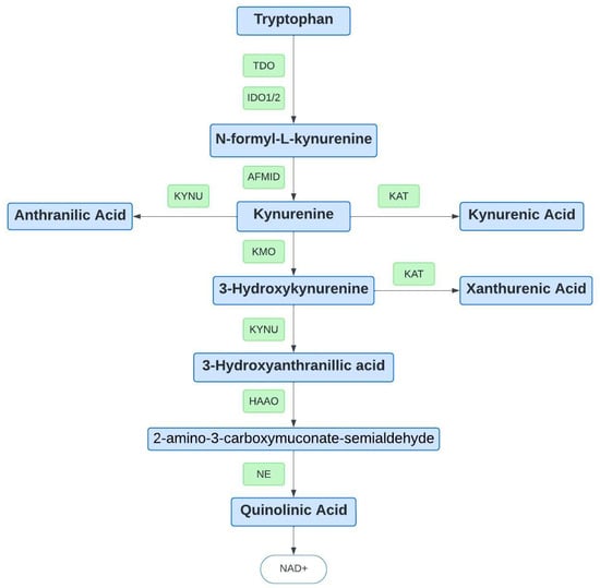 The metabolism of TRP through the KP, where 95% of TRP is metabolized, is shown in Figure 1 [6]. The KP’s initial step involves converting TRP to N-formyl-L-kynurenine by the enzymes tryptophan 2,3-dioxygenase (TDO2) or indoleamine 2,3-dioxygenase (IDO1/2). This is a rate-limiting step of the process, controlling TRP and KP metabolite concentrations [9]. Subsequently, arylformamidase (AFMID) mediates the N-formyl-L-kynurenine conversion to kynurenine (KYN), which three different pathways can metabolize. The neuroprotective pathway uses kynurenine aminotransferases (KATs) to convert KYN to kynurenic acid (KYNA), or kynureninase (KYNU) converts KYN to anthranilic acid (AA), or kynurenine 3-monooxygenase converts KYN to 3-hydroxykynurenine (3-HK). KYNU metabolizes 3-HK to 3-hydroxy anthranilic acid (3-HAA) or by KATs to xanthurenic acid (XA). Next, 3-HAA can be converted into quinolinic acid (QA), a neurotoxic metabolite, in two steps, initially by 2-amino-3-carboxymuconate-semialdehyde by 3-hydroxy anthranilate 3,4-dioxygenase (HAAO) and subsequently by a non-enzymatic reaction. Lastly, QA can be further metabolized to synthesize nicotinamide-adenine-dinucleotide (NAD+), a molecule involved in energy storage and transfer within the cell. Each step plays a critical role in the process, and imbalances of these metabolites are a root cause for associated disease states. For example, having a balanced ratio of KYN and QA can impact depression, and recently, restoring the balance has been studied in preventing substance abuse relapse [10]. Identifying variants in the genes encoding the enzymes responsible for metabolite conversion can help identify genetic components to imbalances in the metabolites of the KP, leading to more precise therapeutic options.