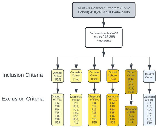 The initial criteria to filter the entire AoU cohort were adults (>18 years of age at the moment of data collection) and participants with short-read whole-genome sequencing (srWGS) (n = 245,388). Next, this group of participants was broken into subgroups based on the International Classification of Disease (ICD) 10th revision codes. The ICD10 codes and their description are listed in Table 1. Cohorts were split into four groups: alcohol use disorder (F10) (n = 4832), cannabis use disorder (F12), cocaine use disorder (F14), opioid use disorder (F11) and other (F13, F15, F14, F18, and F19). The control cohort excluded participants from the previous cohorts with a diagnosis code associated with SUD. Inclusion and exclusion criteria are shown in Figure 2. This criterion was used to build cohorts. Dataset Builder was utilized to create participant datasets categorized by ICD-10 codes to extract each cohort’s demographic information and genomic frequency.