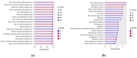 For asthenozoospermia, the top GO biological processes were regulation of transcription by RNA polymerase II, positive regulation of nitrogen compound metabolic processes, positive regulation of cellular metabolic processes, regulation of macromolecule biosynthetic processes, and regulation of RNA metabolic processes (Figure 2a). Important GO Cellular Components terms included cullin-RING ubiquitin ligase complex, ubiquitin ligase complex, transferase complex, cell leading edge, and transcription regulator complex (Figure S3). Furthermore, among the top GO Molecular Functions terms identified were sequence-specific DNA binding, RNA polymerase II transcription regulatory region sequence-specific DNA binding, sequence-specific double-stranded DNA binding, transcription regulatory region nucleic acid binding, and enzyme binding (Figure S4). Finally, among the top KEGG pathways identified were the p53 signaling pathway, renal cell carcinoma, miRNAs in cancer, chronic myeloid leukemia, platinum drug resistance, and cell cycle (Figure 2b).