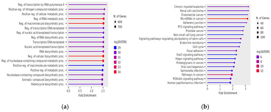 Significant GO biological processes in terms of target genes of affected miRNAs in teratozoospermia (a); significant KEGG pathways in terms of target genes of affected miRNAs in teratozoospermia (b). The size and color of the dots represent the number of genes and the range of statistical significance, respectively. The y-axis represents the GO terms for biological processes and KEGG pathways terms, respectively, and the x-axis represents the fold enrichment. The p-values were corrected for multiple tests using the false discovery rate (FDR).