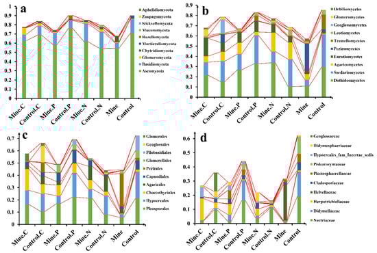 A total of 16 fungal phyla were identified in all the samples, and the abundances of the 10 most abundant phyla were compared in this study (Figure 3a). We found that Ascomycota was the most abundant phylum in all the samples, accounting for 63.45% of the fungi in all the samples, followed by Basidiomycota (average 12.11%), Glomeromycota (average 2.07%), and Rozellomycota (average 0.88%). Mining activities reduce the abundance of Ascomycota and Basidiomycota in bulk soil but increase the abundance of Glomeromycota and Rozellomycota relative to that in bulk soil in nonmining areas. However, the three ecological restoration plants increased the abundance of Ascomycota and Basidiomycota in the rhizosphere soil relative to that in the bulk soil in the mining area. In addition, the abundance of Ascomycota in the rhizosphere soils of C. nubigena and P. cretica was significantly lower than that in the control rhizosphere soil from nonmining areas, whereas N. reynaudiana increased the abundance of Ascomycota in the mining area soil compared with that in the control rhizosphere soil from nonmining areas.