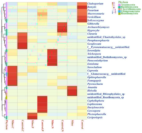 At the genus level, Fusarium was the most abundant genus among all the samples, followed by Macroventuria, Helvella, Cladosporium, and Capronia (Figure 4). We found that the abundances of Fusarium, Macroventuria, Cladosporium, and Solicocozyma significantly decreased in the bulk soils from mining areas compared with those in the bulk soils from nonmining areas. In addition, the abundance of Helvella significantly increased in bulk soils from mining areas compared with that in bulk soils from nonmining areas. The three plants increased the abundance of Fusarium and Capronia in the rhizosphere soil relative to the bulk soil in the mining area, whereas the abundance of Helvella significantly decreased in the rhizosphere soil of the mining area relative to the bulk soil. The abundance of Fusarium and Macroventuria in the three plants from the mining area decreased relative to that in the control rhizosphere soil samples from nonmining areas, whereas the abundance of Capronia in the three plants from the mining area increased relative to that in the control rhizosphere soil samples from nonmining areas. In addition, different plants enriched different fungal groups in the rhizosphere soil of mining areas relative to those in the rhizosphere soil of nonmining areas. We found that Capronia and Sarocladium were significantly enriched in the rhizosphere soil of C. nubigena plants from mining areas compared with the rhizosphere soil from nonmining areas. Ceripoliopsis and Plectosphaerella were significantly enriched in the rhizosphere soil of P. cretica plants from mining areas compared with the rhizosphere soil from nonmining areas. Teichospora and Serendipita were significantly enriched in the rhizosphere soil of N. reynaudiana plants from mining areas compared with the rhizosphere soil from nonmining areas.