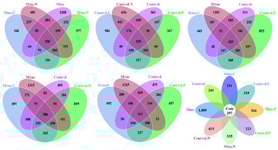 The specific and shared OTUs among different samples were analyzed in this study (Figure 5). For samples from the mining area, Mine. C, Mine. N, Min. P, and Mine contained 348, 601, 577, and 1268 specific OTUs and 538 shared OTUs, respectively. The control samples were collected from nonmining areas. C, Control. N, Control. P, and the control contained 584, 636, 347, and 363 specific OTUs and 535 shared OTUs, respectively. In addition, Mine. C and Control C contained 651 and 1376 specific and 1141 common OTUs, respectively. Mine. N and Control N contained 1049 and 1265 specific and 1191 shared OTUs, respectively. Mine. P and Control P contained 1183 and 860 specific and 974 common OTUs, respectively. The mining of lead and zinc resulted in the production of 1787 specific OTUs and 842 common OTUs in the bulk soil compared with those in the bulk soil from nonmining areas. All the samples generated 191−1089 specific OTUs and 297 shared OTUs.