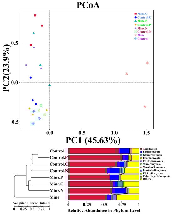 The variations in fungal communities among different samples were assessed via PCoA and weighted UniFrac distance analysis (Figure 6). The results revealed that the fungal community structure of the bulk soil samples from the mining area differed significantly from that of the other samples, indicating that lead zinc mining significantly affected the fungal community structure of the soil. After three types of ecologically restored plants were planted, the fungal community structure in the soil was restored to a certain extent, which was similar to the community structure of the control sample. Cluster analysis revealed that the impact of lead zinc mining on the rhizosphere fungal community structure of the three plant species was greater than the impact of the plants themselves on the rhizosphere fungal community structure, indicating the dominant role of lead zinc mining in the ecological restoration of the plant rhizosphere fungal community structure. In addition, the rhizosphere fungal community structure of different plants in mining areas also showed a certain degree of differentiation.