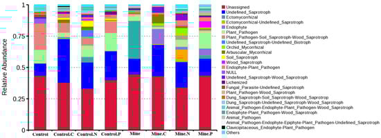We used FUNGuild to predict the fungal guilds in the soil samples. The fungal functions could be classified into 60 categories, of which unassigned functions accounted for the largest proportion, followed by undefined_Saprotroph, ectomycorrhizal, ectomycorrhizal_undefined_saprotroph, endophyte, and Plant_pathogen. The abundances of different guilds varied among the samples (Figure 7). Compared with bulk soil in nonmining areas, bulk soil in mining areas increased the abundance of undefined_Saprotroph and ectomycorrhizal guilds and decreased the abundance of plant pathogen and plant pathogen-Soil_Saprotroph-Wood_Saprotroph guilds. Compared with the bulk soil in the mining area, the three ecological restoration plants increased the abundance of undefined saprotrophs and plant pathogens in the mining area and decreased the abundance of the Ectomycorrozal guild in the rhizosphere soil from the mining area. In addition, the abundance of undefined saprotrophs in the rhizosphere soil of the three plant species from the mining area decreased, whereas the abundance of endophytes increased relative to that in the rhizosphere soil samples from nonmining areas.
