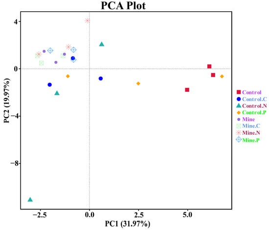 We further used PCA to assess the variations in fungal guilds among different samples (Figure 8). Compared with the control samples, the lead zinc mining samples led to significant differences in the soil fungal guilds. The planting of ecologically restored plants has to some extent restored the guild of soil fungi, making them more inclined toward the control sample. The guilds of different plants have also undergone a certain degree of differentiation.