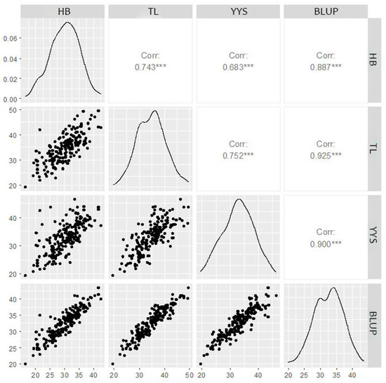 Correlation analysis of maize tassel spindle length. Note: *** Significant correlation at the 0.001 level (both sides); YYS, Yuanyang; TL, Tieling; HB, Hebi; and BLUP, BLUP of Yuanyang, Tieling, and Hebi.