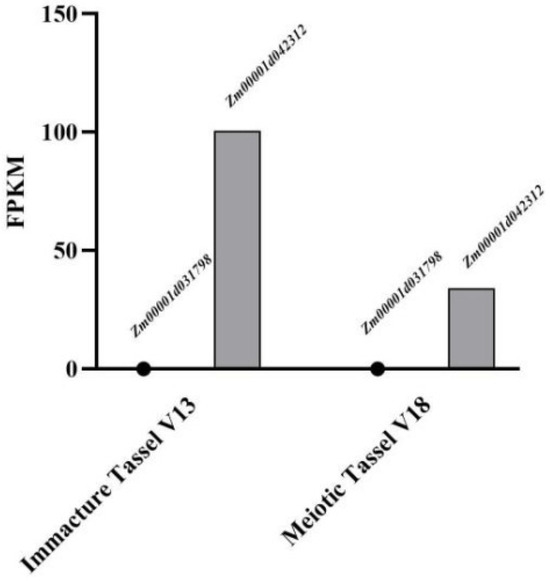 An analysis of the expression patterns of Zm00001d042312 and Zm00001d031798 indicated that Zm00001d031798 is not expressed in the maize tassel in the V13 and V18 stage. Conversely, Zm00001d042312 is highly expressed in the maize tassel (Figure 4). Accordingly, Zm00001d042312 was identified as a candidate gene regulating maize tassel spindle length.