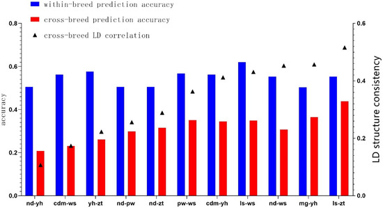 Relationship between cross-breed genome prediction accuracy and LD consistency between populations.
