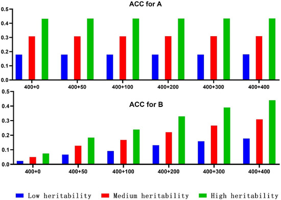 When the same number of individuals joined Group B, the accuracy improvement varied with increasing heritability. Even in direct cross-breed genome assessments between two closely related breeds, the accuracy remains low. In practical applications, when using variety A to predict the genome of variety B, adding an appropriate number of variety B individuals to the reference population is essential for obtaining reliable accuracy.