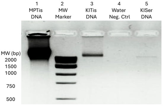 DNA extraction for molecular genetic analyses of mtDNA mutations. Lanes 1 and 3 show DNA extracted from tissue (Tis). Lane 2 shows the molecular weight (MW) marker. Lane 4 shows extraction using water instead of samples (Neg Ctrl). Lane 5 shows DNA extracted from serum (KlSer DNA). MP and KI refer to patient identification and Tis refers to “Tissue” specimen type. Similarly, “KI” refers to patient identification and “Ser” refers to “Serum” specimen type. It is noted that the faint serum band reflects the low amount of DNA isolated from the serum samples [cell-free DNA (cfDNA) present in the circulating serum].