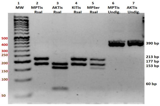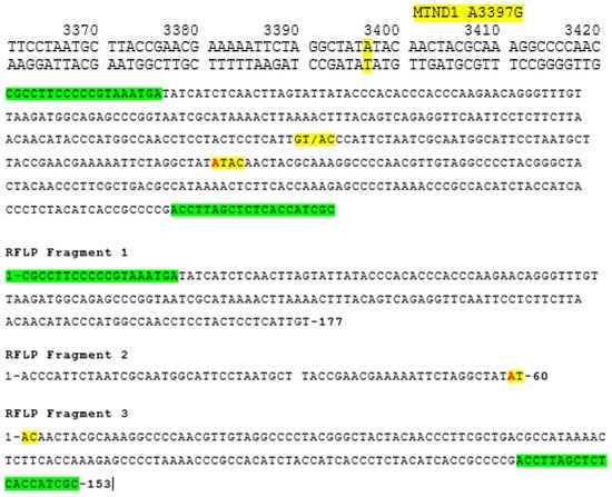 Primer sets were designed using Primer3 (v. 0.4.0) software to amplify a 389 bp region of the ND1 gene (Figure 1 and Figure 2): Forward Primer Sequence: 5′-GCGCCTTCCCCCGTAAATGA-3′; Reverse Primer Sequence: 5′-GCGATGGTGAGAGCTAAGGT-3′. The size of the amplicon was confirmed by restriction fragment length polymorphism (RFLP), as shown in Figure 3 (see also Figure 4), and by direct sequencing, as shown in Figure 5. A 20 μL PCR was performed using the Kapa SYBR Fast Universal (Takara Bio KK4607, Takara Bio Inc., Otsu, Shiga, Japan) with 0.3 μM primer concentration. PCR amplification was performed on 0.25 μg of tissue DNA and 2 μL of serum DNA on a Verity thermal cycler (Applied Biosystems, Foster City, CA, USA) under the following cycling conditions: one cycle of denaturation at 95 °C for 3 min, forty cycles of amplification at 95 °C for 30 s, 57 °C for 30 s, and 72 °C for 30 s. This was followed by one cycle at 72 °C for 3 min (Figure 2). Then, the amplicons were subjected to restriction fragment length polymorphism and sequence analysis. Primers were designed to amplify a 389 bp region of the ND1 gene. The size of the amplicon is 389 base pairs. This was confirmed by restriction fragment length polymorphism (RFLP), as shown in Figure 3, and by direct sequencing, as shown in Figure 5. The starting DNA material yielded by the serum extraction was less than that of the tissue samples and therefore, the endpoint PCR amplification product was much less. However, the quantity yielded was sufficient for sequencing to proceed.