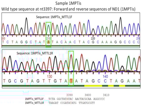 Chromatogram of the DNA sequencing analysis of the MT-ND1 gene. The amplicons were subjected to sequence analysis of the forward and reverse strands of the ND1 gene. Upper panel: normal genetic sequence of the ND1 gene in sample MPTis. Middle panel: mutated genetic sequence of the ND1 gene in sample AKTis. The sequence analysis revealed an A to G substitution of homoplasmic genotype. Lower panel: Sequence analysis of the ND1 gene in sample 8MPSer; A to G substitution of heteroplasmic genotype: R = A + G, Y = C + T (see also Figure 6). The arrow n in the colored boxes emphasize the mutation location of the amplicon.