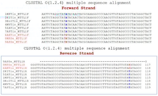 Sequence analysis of the ND1 gene. Multiple sequence alignment of MT-ND1 (forward strand—F; reverse strand—R) of the samples using the CLUSTAL O (1.2.4) multiple sequence alignment software. The presence of a homoplasmic A to G mutation in sample 6AKTis and a heteroplasmic A/G mutation in samples 8MPSe and 9APSe is highlighted in red characters. More specifically, the tissue sample of patient 6AKTis shows a homoplasmic A to G substitution mutation, while serum samples 8MPSe and 9APSe show heteroplasmy for the A/G mutation (R = A + G; Y = C + T). The sequence of the remaining six samples (1MPTis, 2KITis, 3KoITis, 4MVTis, 5ZATis, and 7APTis) shows a normal genotype. The blue and red colors of the letters are intended to highlight the normal sequence and the mutation, respectively.