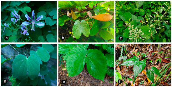 Species morphological diversity within Phanera. (a) P. yunnanensis; (b) P. aureifolia; (c) P. japonica; (d) P. saigonensis; (e) P. erythropoda; (f) P. championii.