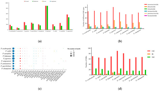 Identification of dispersed repeat sequences and SSRs in the cp genomes of nine Phanera species. (a) the number of dispersed repeat sequences of varying lengths within the cp genomes of these species; (b) the number of SSRs in the cp genomes of these species; (c) the number of SSRs with different motifs; (d) The number of SSRs in LSC, SSC, and IRs of the cp genomes of these species.