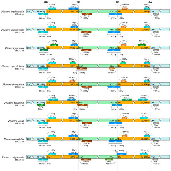 Comparison of LSC, SSC, and IRs boundaries in the cp genome of nine Phanera species.