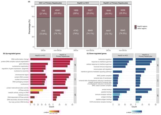 (A) Percentage of differentially expressed genes (DEGs) located in in-house HepG2-specific karyotype regions and the other regions (Chi-square test, p > 0.05) between different pairwise comparisons of HepG2, HCC, and primary hepatocytes (PH); (B) over-representational analysis showing 5 significantly over-represented terms in biological processes, cellular compartmentalization and molecular function of upregulated genes and downregulated genes in HepG2 karyotype regions (C) between groups HepG2 and HCC, as well as HepG2 and PH.