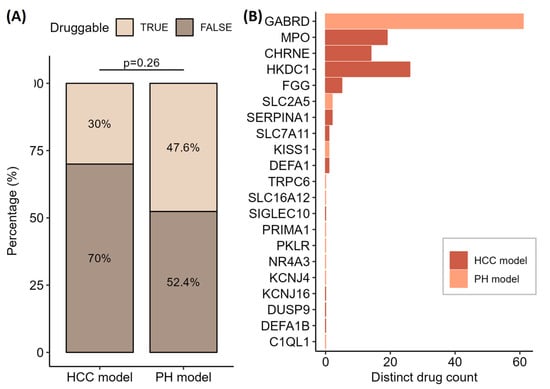 For all 61 genes, we looked at their druggability in the drug–gene interaction database (Figure 4A) to see which ones can be therapeutically modulated by medicines. A larger proportion of druggable genes were found in the gene list of the primary hepatocytes model (Fisher’s exact test, p = 0.26). Despite that, more druggable genes with at least one or more distinct drugs were found in the HCC model (Figure 4B). When examining the complete dataset of 397 genes for the HCC model and 421 genes for the PH model, we found 144 and 148, respectively, druggable genes (Fisher’s exact test, p = 0.77).