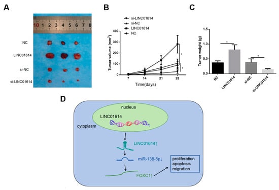 LINC01614 promoted the progression of OSCC in vivo. (A) Representative images of the subcutaneous OSCC tumors of nude mice. (B,C) Volumes and weights of the OSCC tumors. (D) Schematic depicting the role of the LINC01614/miR-138-5p/FOXC1 axis in the progression of OSCC. * p < 0.05.
