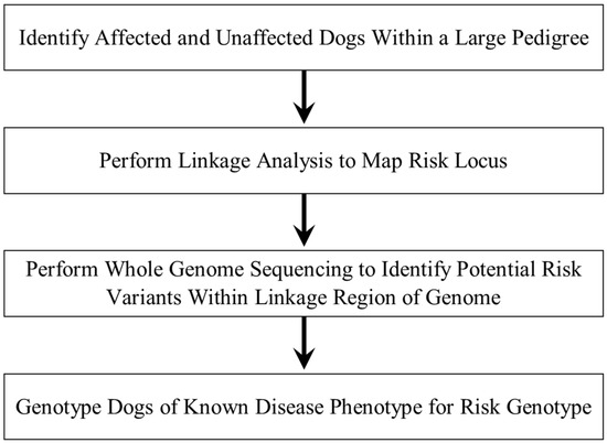 In order to identify the potential DNA sequence variant responsible for FS in Basenjis, the disease phenotypes of dogs within a large pedigree were ascertained. DNA samples from these dogs were used to perform linkage mapping of the disease locus followed by whole genome sequence analysis to identify potential risk variants within the mapped region. All of the dogs within the pedigree were then genotyped for a candidate variant to assess concordance between phenotype and genotype. This strategy is summarized in Figure 1.