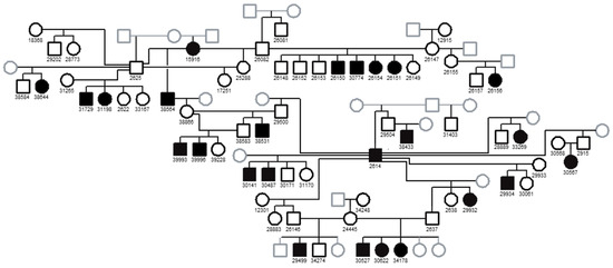 Pedigree of the Basenji family used for linkage mapping of the FS locus. Filled black squares: affected males; filled black circles: affected females; open black squares: unaffected males; open black circles: unaffected females; gray open squares, males of unknown phenotype; gray open circles: females of unknown phenotype.
