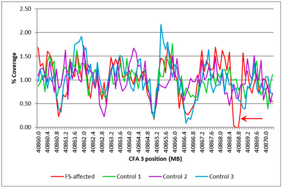 Comparison of percent coverage in a part of the CFA3 target region between an FS-affected dog and three controls. The region represented in this graph starts at 40,860,000 to 40,870,300 bp of CFA3 in intervals of 100 bp. The percent coverage is the average coverage of the interval normalized for the average genome coverage for the individual dog. The arrow indicates the gap in coverage that was unique to the affected Basenji.
