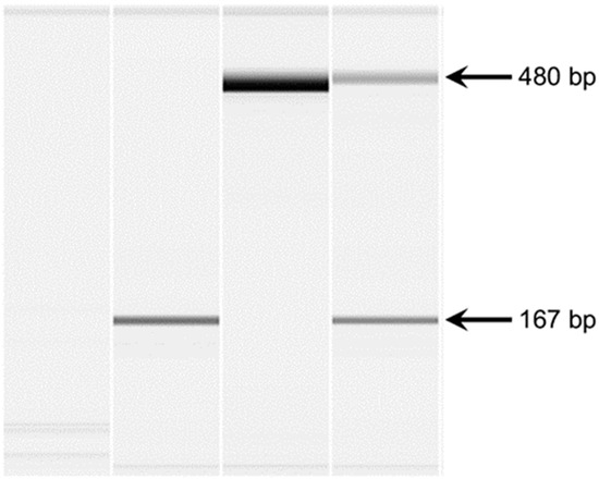Microcapillary electrophoretograms of PCR amplicons produced with primers spanning the gap in the FAN1. Lane 1 represents a negative control. PCR was performed with DNA from an FS-affected dog (2) and two FS-unaffected dogs (lanes 3 and 4). The FS-affected dog produced a 167 bp amplicon, which is smaller than the expected band. One of the FS-unaffected dogs (3) produced the expected band, and the other dog (lane 4) produced the expected band and the deletion allele band.