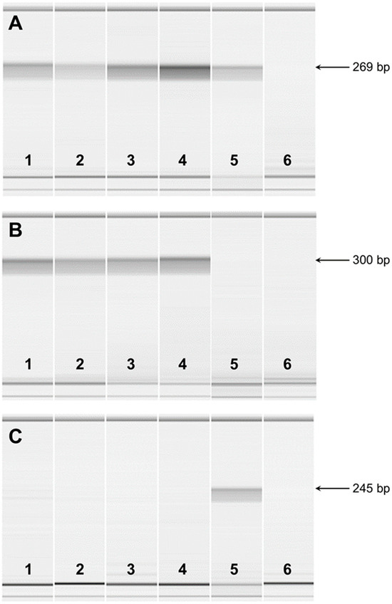 Microcapillary electrophoretograms of RT-PCR amplicons from FAN1 mRNA. RT-PCR was performed with total RNA extracted from the kidneys of two FS-unaffected dogs (1 and 2), the blood of two FS-unaffected dogs (3 and 4), and one FS-affected dog (5). Lane 6 represents a negative control. (A) RT-PCR was performed with primers from exon 5 to exon 7 of the FAN1 gene. The expected amplicon size was 269 bp. (B) RT-PCR was performed with primers from exon 12 to exon 14 of the FAN1 gene. The expected amplicon size was 300 bp. (C) RT-PCR was performed with primers from exon 12 to intron 13 of the FAN1 gene. The expected amplicon size was 245 bp.