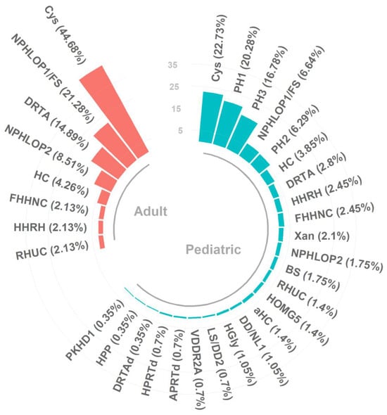 Distributions of monogenic conditions across pediatric and adult populations in the included studies. Cys, cystinuria; HC, hypercalciuria; RHUC, renal hypouricemia; dRTA, primary distal renal tubular acidosis; DD/NL1, Dent disease/nephrolithiasis type 1; HHRH, hereditary hypophosophatemic rickets with hypercalciuria; FHHNC, familial hypomagnesemia with hypercalciuria and nephrocalcinosis; HOMG5, hypomagnesemia 5, renal, with ocular involvement; BS, Bartter syndrome; PH1, primary hyperoxaluria 1; LS/DD2, Lowe syndrome/Dent disease 2; aHC, absorptive hypercalciuria; DRTAd, renal tubular acidosis with deafness; PH2, primary hyperoxaluria 2; APRTd, adenine phosphoribosyltransferase deficit; HGly, hyperglycinuria; Xan, xanthinuria; HPP, hypophosphatasia; HPRTd, hypoxanthine guanine phosphoribosyltransferase deficiency; PKHD1, autosomal recessive polycystic kidney disease; PH3, primary hyperoxaluria 3; VDDR2A, vitamin D-dependent rickets, type 2A; NPHLOP1/FS, hypophosphatemic nephrolithiasis/osteoporosis/Fanconi syndrome; and NPHLOP2, hypophosphatemic nephrolithiasis/osteoporosis-2. Pediatric data are in sky blue, adult data in red.