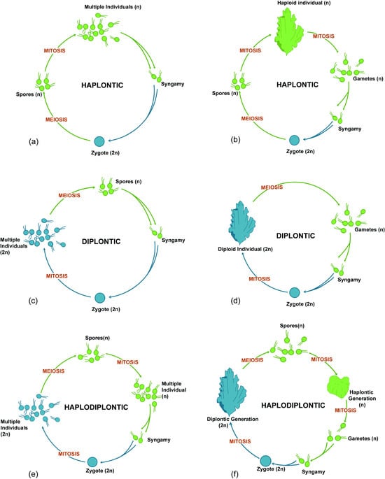 Schematic comparison between (a,b) haplontic, (c,d) diplontic, and (e,f) haplodiplontic life cycles in unicellular (a,c,e) and multicellular (b,d,f) organisms (illustrated by Shirin Sabeti).