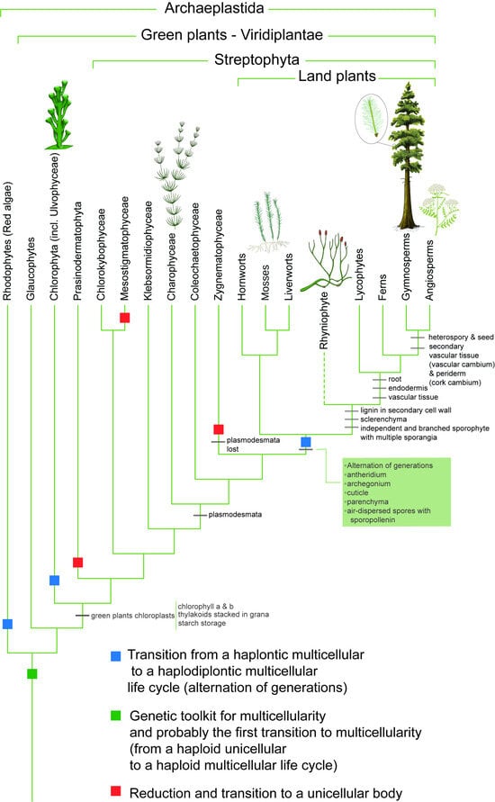 When broadly defined as the ability to sustain a community of cells, the transition to multicellularity is estimated to have evolved up to 45 times in the Tree of Life [23,24,25]. However, complex multicellularity, defined as having several levels of organization and a considerable degree of complexity within each level and characterized by cell-to-cell signaling and a heritable phenotype [26], depending on how strict or loose our criteria are, is evident in at most 11 transitions, and uncontroversially in the 2 most familiar ones—the evolution of animals and plants; thus, the evolution of multicellularity in land plants represents one of these transitions across eukaryotes. With more permissive criteria, we may also include once in Amoebozoa (dictyostelids), three times within fungi (including chytrids, ascomycetes, and basidiomycetes), and six occurrences across the three major photosynthetic eukaryotic clades—two occurrences each in rhodophytes, stramenopiles, and chlorobionta, with the land plants representing one of the two chlorobionta instances [26,27,28].