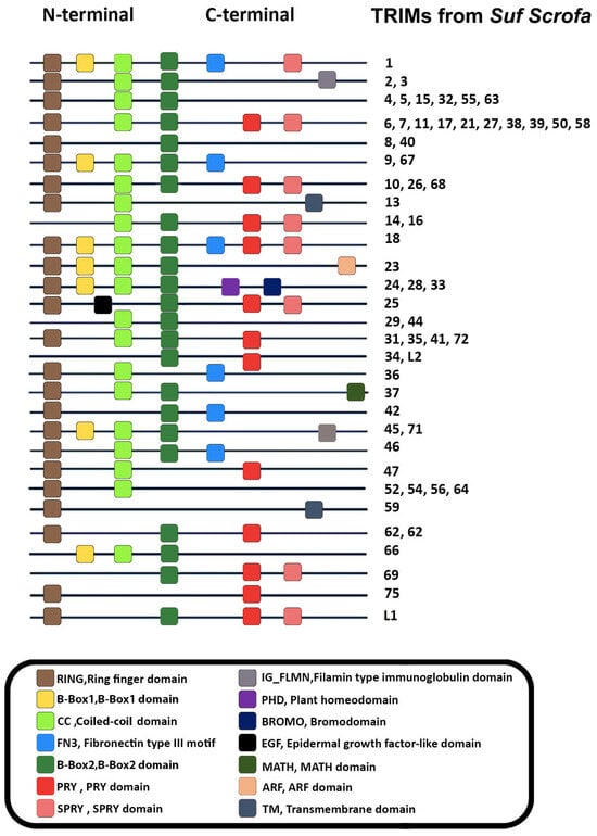 TRIMs are E3 ubiquitin ligase family proteins, which are present in almost all mammals [,]. The amino-terminal region of the TRIM protein contains three domains that are considered relatively conservative (RBCC): the coiled-coil domain (CC), the B-Box domain (BBox), and the Really Interesting New Gene (RING) domain. Cysteine, histidine, and zinc comprise the RING domain, a zinc finger motif that gives TRIMs their E3 ubiquitin ligase activity. Cysteine histidine–zinc binding motifs are also present in the B-Box domains, which include B-Box1 and/or B-Box2. Several α helices make up the supercoiled CC domain of TRIM, which is essential for the formation of TRIM homologous polymers. Likewise, research indicates that the N-terminal of porcine TRIMs is conservative based on TRIM sequences in animals [,]. The RING domain of the protein raises the possibility that it has DNA-binding ability, even though its exact function is not very well known []. While TRIMs are highly conserved across species, they might consist of different domains in the same species. For instance, we identified that the N-terminal of porcine TRIMs is conservative based on TRIM sequences in animals (Figure 1). On the other hand, there are numerous variable domains at the C-terminal. It is noteworthy to mention that the majority of swine TRIMs feature RBCC-PRY/SPRY domains; motifs identical to these may be found in porcine TRIMs 10, 26, and 68. These TRIMs have one PRY/SPRY domain in the C-terminal region, one B-Box motif in the N-terminal, and one RING motif in the N-terminal.