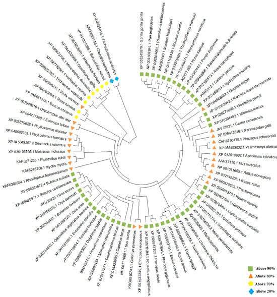 Phylogenetic analysis of TRIM26 depicting sequence divergences between different species. The amino acid sequences of 78 different species and porcine TRIM26 were compared using MEGA 11. Homologies above 90%, 80%, 70%, and 20% are shown above.