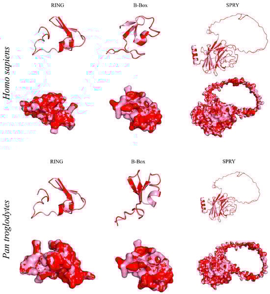 Predicted structural similarity between porcine TRIM26 and TRIM26 of Homo sapiens and Pan troglodytes. Porcine TRIM26 is shown by the color red, while Homo sapiens and Pan troglodytes TRIM26 are indicated by the color pale pink.