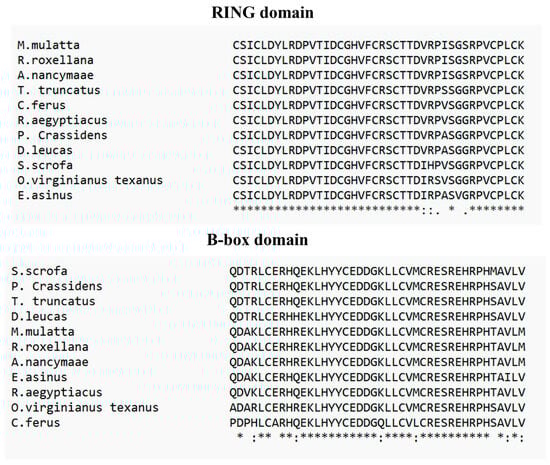 RING domain and B-Box domain comparsion of TRIM26 of Sus scrofa with 10 other species. ‘*’ shows a highly conserved residue, ‘:’ shows a residue that shares some similar biochemical properties, and ‘.’ shows little similarity between the aligned sequences.