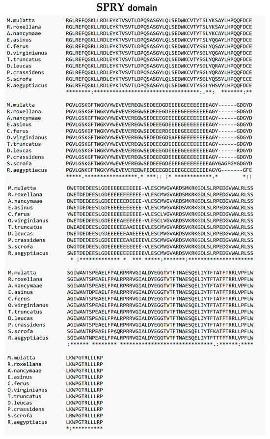 SPRY domain comparison of TRIM26 of Sus scrofa with 10 other species. ‘*’ shows a highly conserved residue, ‘:’ shows a residue that shares some similar biochemical properties, and ‘.’ shows little similarity between the aligned sequences.
