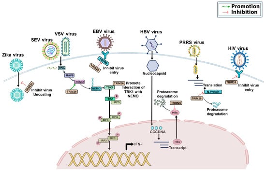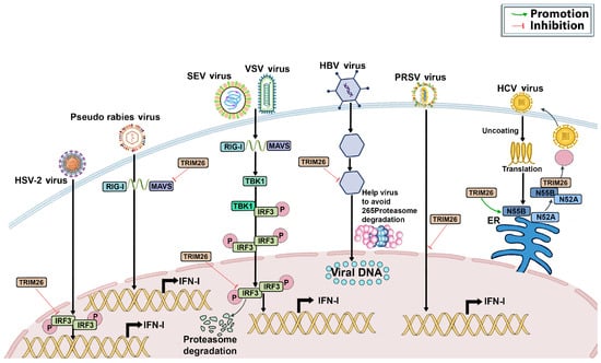 TRIM26 functions as a suppressor of immune responses during a viral infection. The ubiquitination of IRF3 or its upstream sensors by TRIM26 results in immune suppression during viral infection. Ultimately, the replication of viruses, such as HSV-2, PRV, SEV, VSV, HBV, HCV, and PRRSV, is facilitated in a TRIM26-dependent manner.