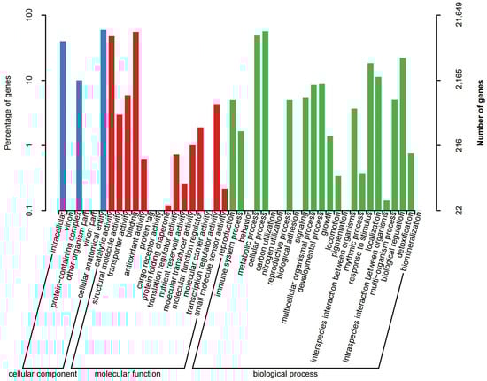 Furthermore, the Nr identity distribution and E-value were estimated to evaluate the BLAST results. Statistical analysis proved that nearly three-fifths (59.41%) of mapped sequences represented a noticeable homology (<1.0 × 10−50), while the rest of the unigenes had E-values ranging from 1.0 × 10−50 to 1.0 × 10−11 (Figure S2A). Additionally, most of the mapped unigenes (84.26%) exhibited a similarity above 60%. Among them, 40.99% unigenes showed a similarity of >90%, and only 8.31% unigenes were below 50% (Figure S2B). The high identity along with a significant E-value demonstrated the reliability of de novo assembly quality. Sequence comparison of three homologues species showed that over half of unigenes (55.71%) exhibited the best hits to those of Rhododendron williamsianum Rehder & E. H. Wilson, while 13.13% unigenes were matched to Camellia sinensis and 11.38% unigenes to Actinidia chinensis var. (Figure S2C). Furthermore, GO annotation was conducted to facilitate the functional classification of the unigenes. Results showed that the entire estimated unigenes were classified into three major classes as biological process, cellular component and molecular function. In total, 21,649 unigenes were identified from sequenced HQI, HQO, HQH and HQL groups based on the sequence similarity and classified into 45 functional groups (Figure 1). The biological process category was subdivided into 24 classes, in which the predominant groups were cellular process (12,282 unigenes, 56.73%) and metabolic process (10,567 unigenes, 48.81%), followed by response to stimulus (3962 unigenes, 18.3%) and localization (2447 unigenes, 11.3%), indicating that the defense response mechanism to stimulus was active during the flowering development. In cellular component, most unigenes (12,873 unigenes, 59.46%) were involved in the cellular anatomical entity group. The second group was intracellular with 8634 unigenes accounting for 39.88%. Within the molecular function category, binding (12,007 unigenes, 55.46%) and catalytic activity (10,292 unigenes, 47.54%) were the two predominant groups in terms of quantity.