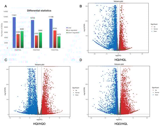 Statistics of differential expressed genes and comparisons between different groups. (A) Differentially expressed genes in different compared groups. The horizontal axis represents distinct sets of differentially expressed genes, where blue color represents the differential expressed genes in different groups, red color indicates upregulated, and green signifies downregulated. Meanwhile, the vertical axis corresponds to the number of differential expressed genes. (B) Volcano plot of differentially expressed genes in HQI/HQL. (C) Volcano plot of differentially expressed genes in HQI/HQO. (D) Volcano plot of differentially expressed genes in HQO/HQL. Each point on the graph represents a gene, with the horizontal axis indicating the logarithmic-fold change in gene expression between two samples. The vertical axis represents the negative logarithm of the false discovery rate. Blue points represent downregulated differentially expressed genes, red points represent upregulated differentially expressed genes, and gray points represent non-differentially expressed genes.