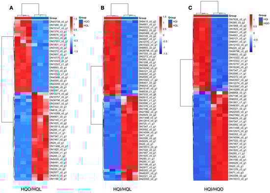 The heatmaps of DEG expression patterns in different groups of R. decorum Franch. (A) DEG expression patterns in HQO/HQL group. (B) DEG expression patterns in HQI/HQL group. (C) DEG expression patterns in HQI/HQO group. Clustering plot depicting the differential expression analysis of genes belonging to the EF-hand protein family. Blue color represents the downregulated and red color the upregulated.