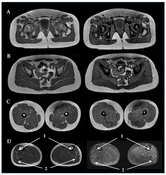 Muscle MRI of P1: on the left, Axial T1w sequences of pelvis (A), hip region (B), thighs. (C), and legs (D). On the right, T1 flex sequences of pelvis (A), hip region (B), and thighs (C) and FSE T1 STIR sequences of legs (D). The arrows highlight distal bilateral fibro-adipose infiltration of the anterior tibialis (1) and the peroneal group (2) in both sequences.