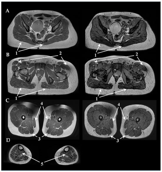 Muscle MRI of P2: on the left, Axial T1w sequences of pelvis (A), hip region (B), thighs (C), and legs (D). On the right, T1 flex sequences of pelvis (A), hip region (B), and thighs (C). The arrows highlight bilateral gluteus maximus (1) and tensor fasciae lata (2) infiltration, thigh posterior region (3) and gracilis (4) minimum substitution, reduction of leg trophism, diffuse muscular involvement with the exception of posterior tibialis and minimum soleus engagement (5).