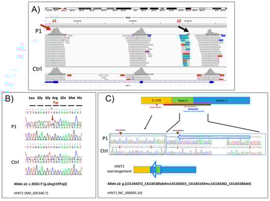 (A) Next-generation sequencing (NGS) visualization with the IGV of the heterozygous variant (a1) c.355C>T [p.(Arg119Trp)] in HINT1 exon 3 (NM_005340.7) (red arrow) and of the rearrangement in region 5′UTR-exon1-intron1 (a2) (black arrow) visualized as a split and many read pairs with the same orientation suggesting the presence of a small inversion. (B) Electropherogram of Sanger sequencing confirms the c.355C>T [p.(Arg119Trp)] variant (a1) in P1. The arrow indicates the heterozygous variant compared to normal control (Ctrl). The corresponding codons are superimposed. (C) A schematic representation of the complex rearrangement. (top) Red boxes show deleted regions (23 bp in 5′UTR and 937 bp in 5′UTR-exon1-intron1), and the blue arrowed box shows the inverted region at the end of exon1 and initial part of intron 1. Electropherogram of Sanger sequencing (middle) of complex rearrangement (a2) located in the HINT1 region 5′UTR-exon 1-intron 1 was detected as g.[131164372_131165305delins131165015_131165143inv;131165362_131165385del] (NC_000005.10). (bottom) Schematic proposed representation of the rearrangement.