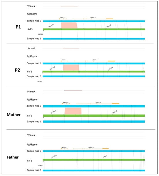 Identification and visualization of the deletion by OGM. Reference map: green bar; sample map: blue bar. OGM revealed a heterozygous ~800 bp deletion (pink bar in the SV track) in the patient [ogm[GRCh38] 5q23.3(131160930_131174751)x1], his brother [ogm[GRCh38] 5q23.3(131160943_131174737)x1], and mother [ogm[GRCh38] 5q23.3(131160926_131174755)x1] compared to the reference genome (Ref hg38, green bar). The deletion, absent in the father, was located within a range of 13 Kb (chr5:131,160,929–131,174,750 hg 38), partially involving HINT1 and LYRM7.