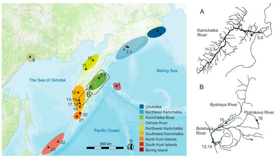 - Krohin, E.M. Rivers of Kamchatka and Their Importance in Salmon Reproduction. Vopr. Geogr. Kamch. 1965, 3, 17–24. [Google Scholar]