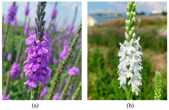 Figure 1. Phenotypes of (a) the purple V. stricta Vent. (P) and (b) white natural mutation (W).